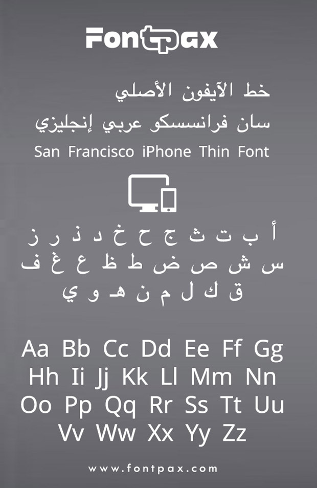 خط الآيفون الأصلي سان فرانسيسكو عربي إنجليزي .. يعتبر خط سان فرانسيسكو أحد خطوط الآيفون الأصلية ، ويأتي بالشكل الرفيع مع إمكانية الكتابة باللغتين العربية والإنجليزية ، يمكن استخدام الخط في جميع أنواع الأجهزة المكتبية والموبايلات ، وهو متاح للتحميل المجاني الآن .